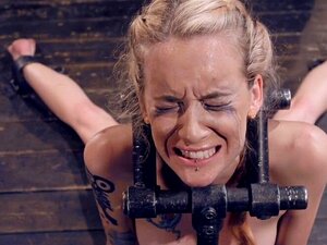 Une nana se fait fouetter dans des engins diaboliques. L'esclave blonde Jeze Belle dans un engin métallique diabolique avec la tête dans une boîte en bois se fait fouetter durement par le maître puis dans un engin de pont arrière sur le sol choquée
