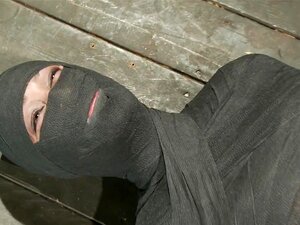 Pack bien emballé, c'est 4 sur 4 du show en direct de juillet. Le corps courbé de Trina est d'abord attaché étroitement, puis enveloppé dans une enveloppe claire, puis noir. Tout ce qui est découvert, ce sont ses yeux, ses pieds et son trou de bouche. So