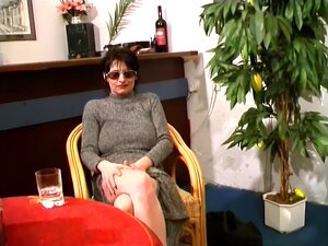 Cheveux Bruns plus âgés avec une chatte hirsute frappe une tige plus jeune