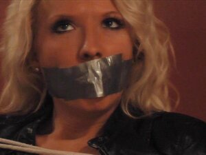Une belle blonde en pantalon de cuir serré est ligotée et bâillonnée par un cambrioleur. Regardez-la se débattre et gémir de plaisir. Satisfaction garantie.