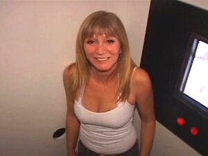 Salope blonde reçoit une éjaculation. Salope blonde reçoit un cumshot après avoir baisé et sucé une bite noire à glory hole