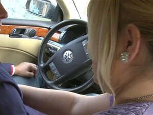 Blonde pulpeuse fait une pipe dans une voiture