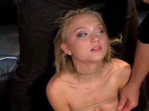 Cathy Heaven dans Stunning Slave - HarmonyVision, la bombe blonde Cathy Heaven habillée d'un basque rouge sexy et de bas résille monte lentement les escaliers à quatre pattes armée d'un plug anal alors que deux queues palpitantes attendent toute son atte