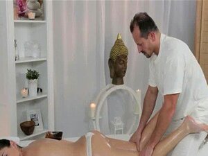 Le masseur frotte de l'huile sur le corps sexy d'une brune. Le masseur demande à la sexy brune de s'allonger sur une table de massage, puis lui frotte de l'huile et la masse avec des pierres jusqu'à ce qu'elle enfonce sa bite dans sa chatte